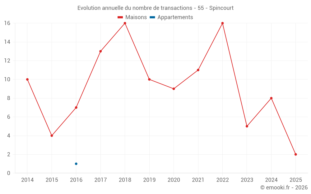 Le prix médian sur les 14 transactions de maisons des 24 derniers mois dans la commune de Spincourt était de 801 € par mètre carré pour une valeur foncière médiane de 122 500 €. Sur cette période 60% des transactions se sont situées entre 588 et 1 754 € par mètre carré (du 2ème au 8ème déciles).
