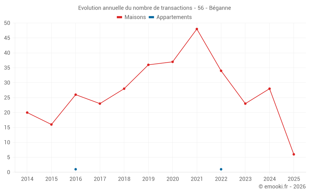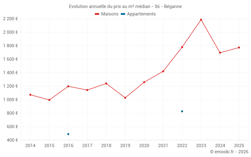 Le prix médian sur les 20 transactions de maisons des 12 derniers mois dans la commune de Béganne était de 1 800 € par mètre carré pour une valeur foncière médiane de 145 632 €. Sur cette période 60% des transactions se sont situées entre 963 et 2 457 € par mètre carré (du 2ème au 8ème déciles).