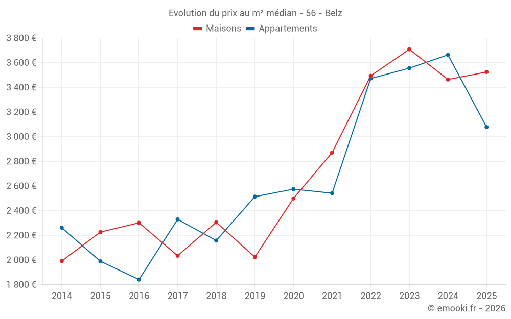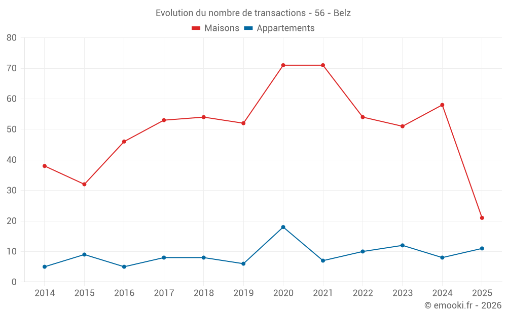 Le prix médian sur les 21 transactions de maisons des 6 derniers mois dans la commune de Belz était de 3 525 € par mètre carré pour une valeur foncière médiane de 350 000 €. Sur cette période 60% des transactions se sont situées entre 2 583 et 4 566 € par mètre carré (du 2ème au 8ème déciles).