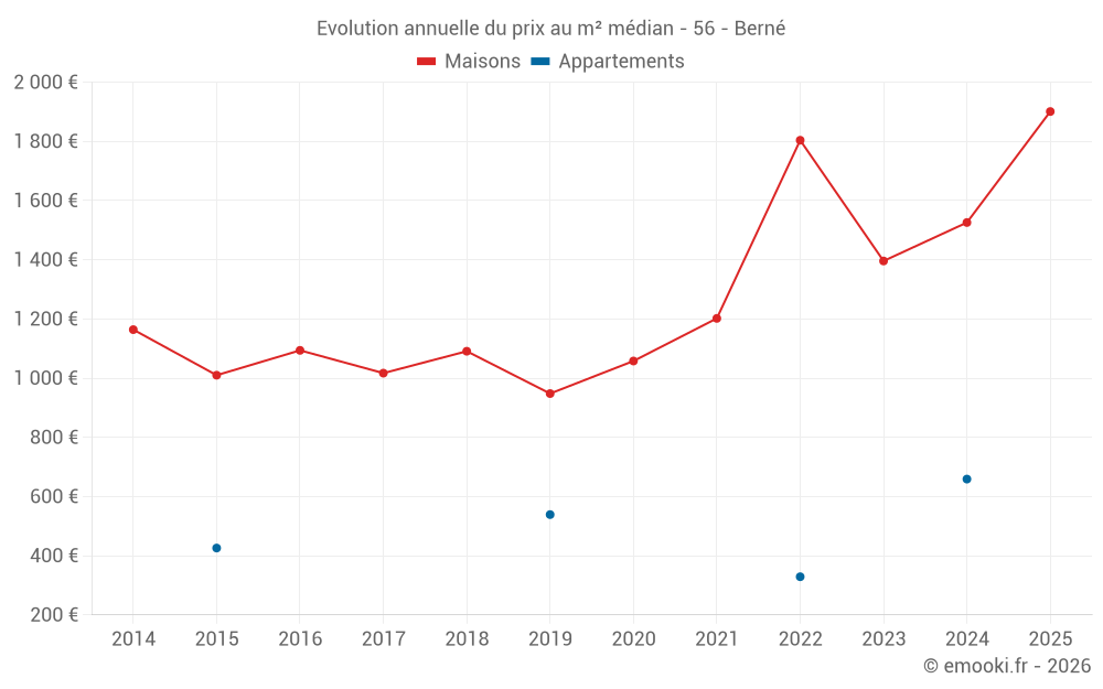 Le prix médian sur les 36 transactions de maisons des 24 derniers mois dans la commune de Berné était de 1 540 € par mètre carré pour une valeur foncière médiane de 135 000 €. Sur cette période 60% des transactions se sont situées entre 1 083 et 2 250 € par mètre carré (du 2ème au 8ème déciles).