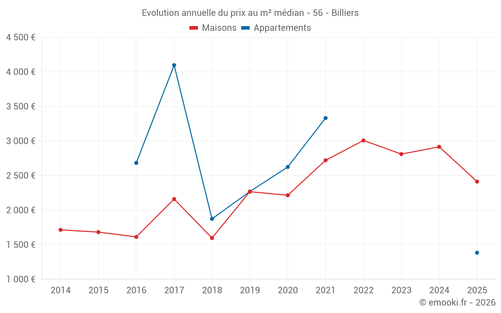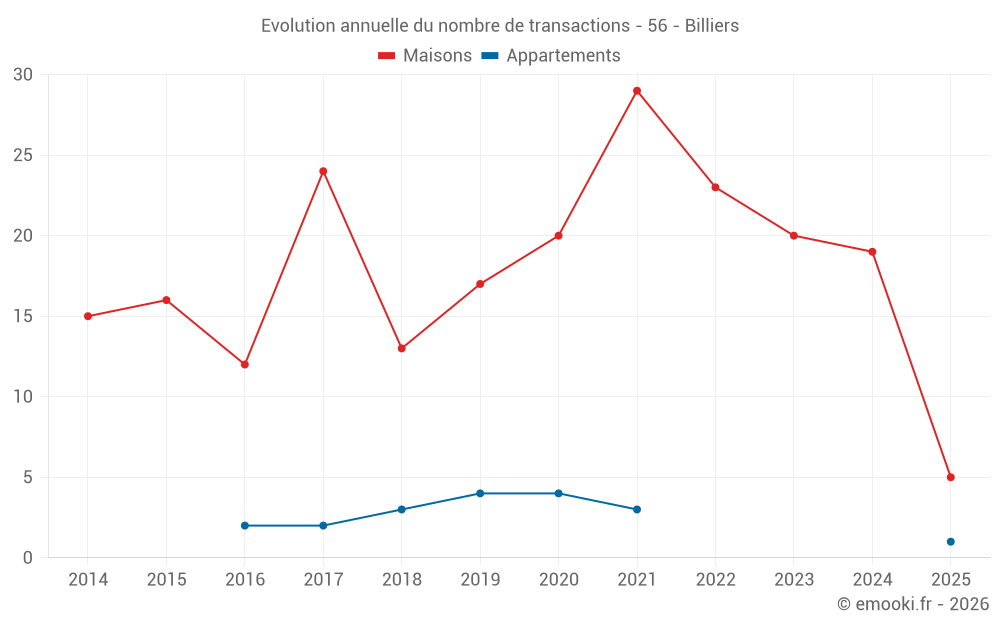 Le prix médian sur les 35 transactions de maisons des 24 derniers mois dans la commune de Billiers était de 2 816 € par mètre carré pour une valeur foncière médiane de 283 465 €. Sur cette période 60% des transactions se sont situées entre 2 093 et 3 585 € par mètre carré (du 2ème au 8ème déciles).