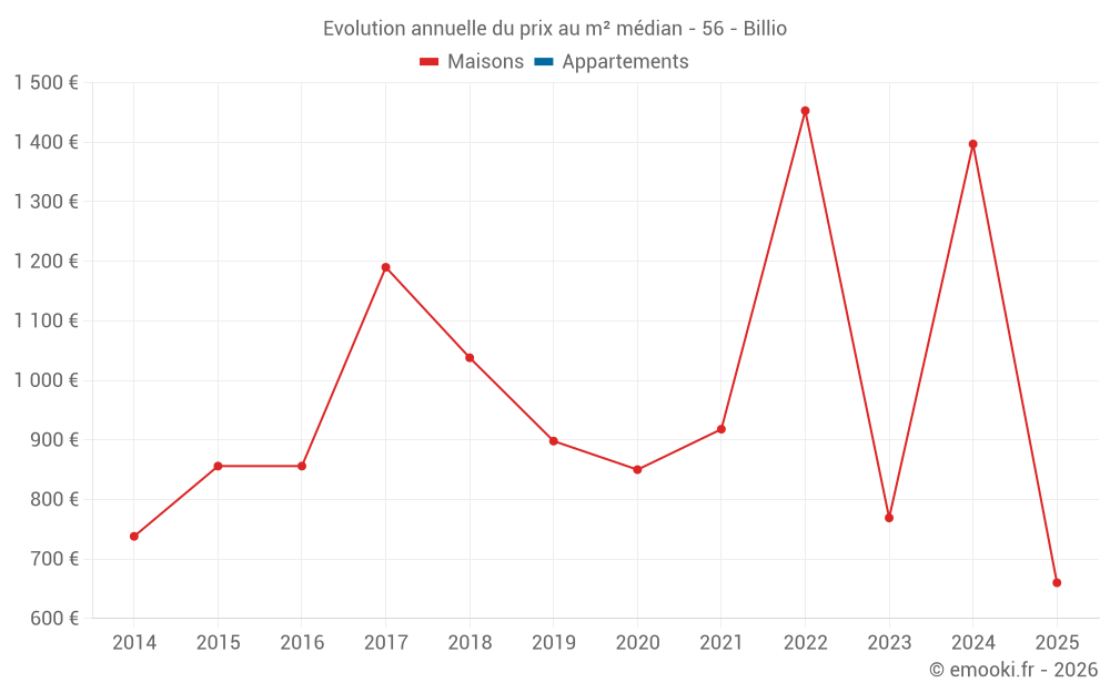 Le prix médian sur les 16 transactions de maisons des 24 derniers mois dans la commune de Billio était de 1 316 € par mètre carré pour une valeur foncière médiane de 87 500 €. Sur cette période 60% des transactions se sont situées entre 641 et 1 994 € par mètre carré (du 2ème au 8ème déciles).