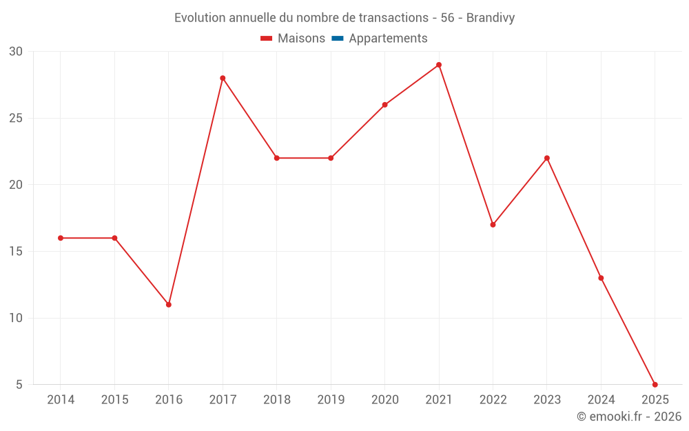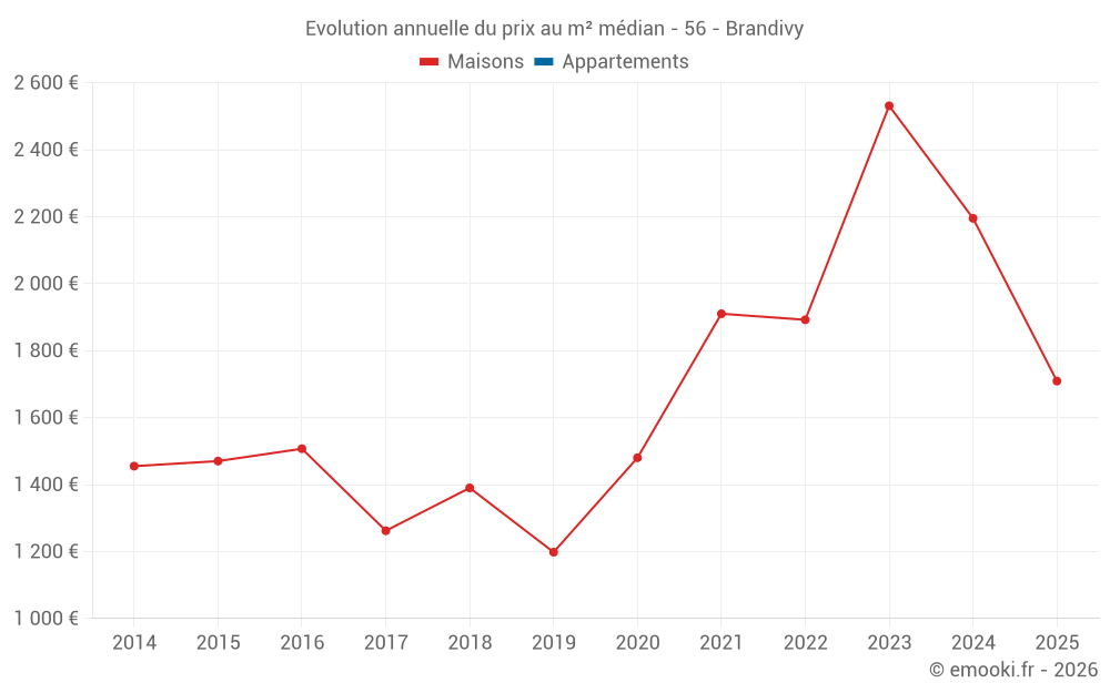 Le prix médian sur les 27 transactions de maisons des 24 derniers mois dans la commune de Brandivy était de 2 195 € par mètre carré pour une valeur foncière médiane de 245 000 €. Sur cette période 60% des transactions se sont situées entre 1 763 et 2 914 € par mètre carré (du 2ème au 8ème déciles).