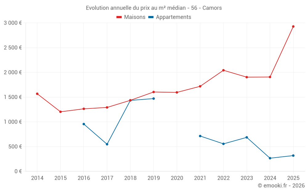 Le prix médian sur les 39 transactions de maisons des 12 derniers mois dans la commune de Camors était de 2 000 € par mètre carré pour une valeur foncière médiane de 196 800 €. Sur cette période 60% des transactions se sont situées entre 1 619 et 2 957 € par mètre carré (du 2ème au 8ème déciles).