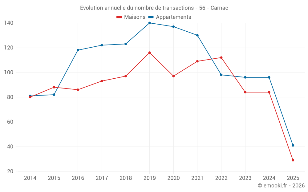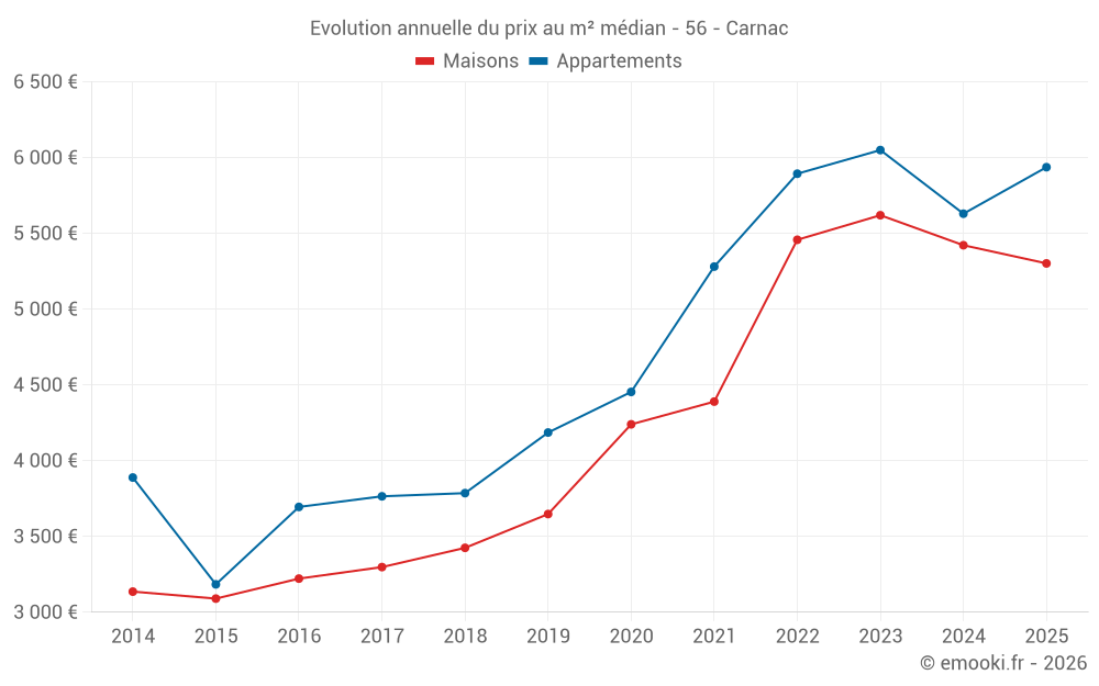Le prix médian sur les 29 transactions de maisons des 6 derniers mois dans la commune de Carnac était de 5 302 € par mètre carré pour une valeur foncière médiane de 620 352 €. Sur cette période 60% des transactions se sont situées entre 3 795 et 8 283 € par mètre carré (du 2ème au 8ème déciles).