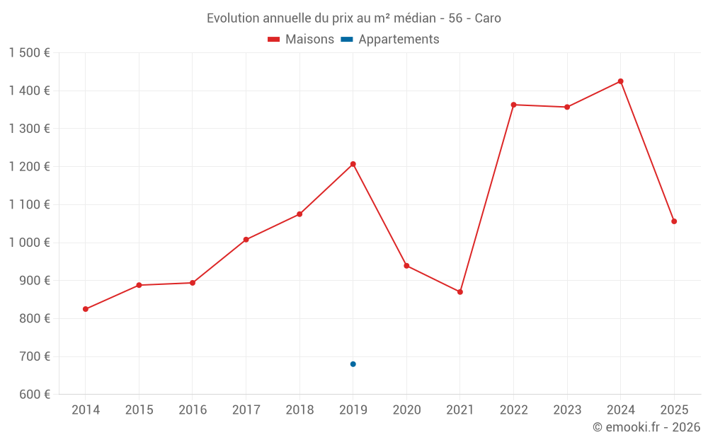 Le prix médian sur les 22 transactions de maisons des 12 derniers mois dans la commune de Caro était de 1 148 € par mètre carré pour une valeur foncière médiane de 85 000 €. Sur cette période 60% des transactions se sont situées entre 698 et 1 662 € par mètre carré (du 2ème au 8ème déciles).
