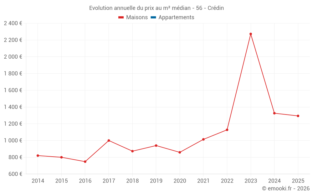 Le prix médian sur les 17 transactions de maisons des 12 derniers mois dans la commune de Crédin était de 1 371 € par mètre carré pour une valeur foncière médiane de 122 010 €. Sur cette période 60% des transactions se sont situées entre 922 et 1 804 € par mètre carré (du 2ème au 8ème déciles).