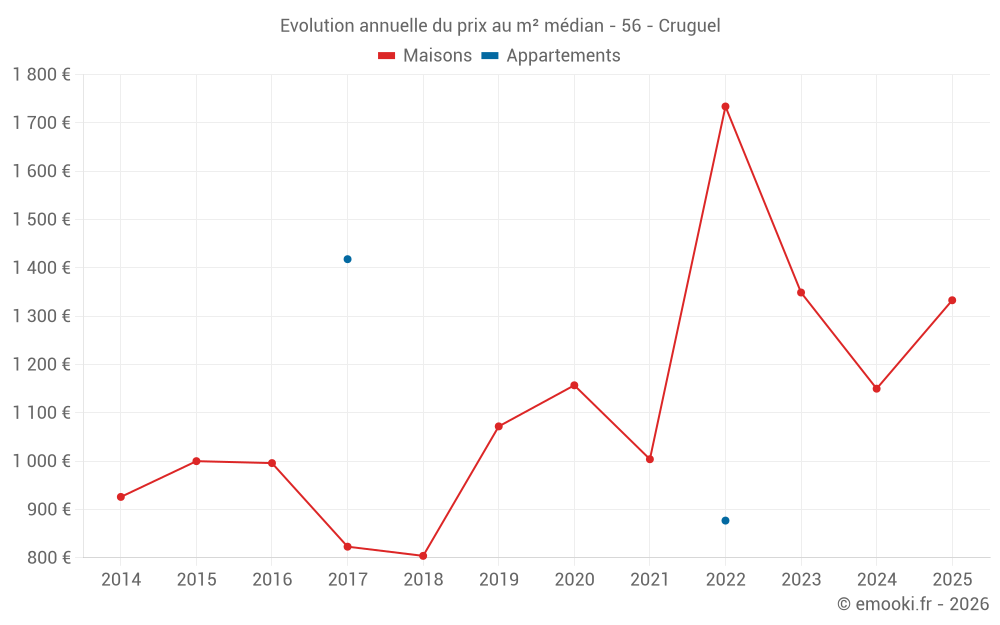 Le prix médian sur les 23 transactions de maisons des 24 derniers mois dans la commune de Cruguel était de 1 304 € par mètre carré pour une valeur foncière médiane de 120 000 €. Sur cette période 60% des transactions se sont situées entre 935 et 1 990 € par mètre carré (du 2ème au 8ème déciles).