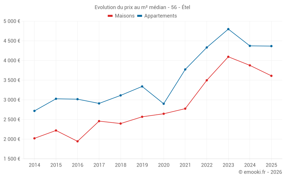 Le prix médian sur les 18 transactions de maisons des 6 derniers mois dans la commune d'Étel était de 3 612 € par mètre carré pour une valeur foncière médiane de 303 000 €. Sur cette période 60% des transactions se sont situées entre 3 158 et 5 357 € par mètre carré (du 2ème au 8ème déciles).