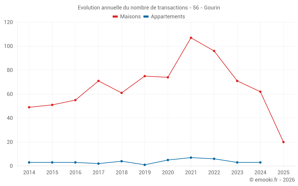 Le prix médian sur les 20 transactions de maisons des 6 derniers mois dans la commune de Gourin était de 1 049 € par mètre carré pour une valeur foncière médiane de 106 000 €. Sur cette période 60% des transactions se sont situées entre 744 et 1 722 € par mètre carré (du 2ème au 8ème déciles).