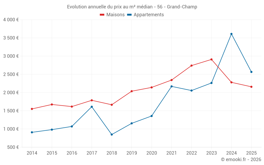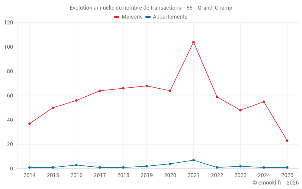 Le prix médian sur les 23 transactions de maisons des 6 derniers mois dans la commune de Grand-Champ était de 2 159 € par mètre carré pour une valeur foncière médiane de 211 200 €. Sur cette période 60% des transactions se sont situées entre 1 638 et 3 202 € par mètre carré (du 2ème au 8ème déciles).
