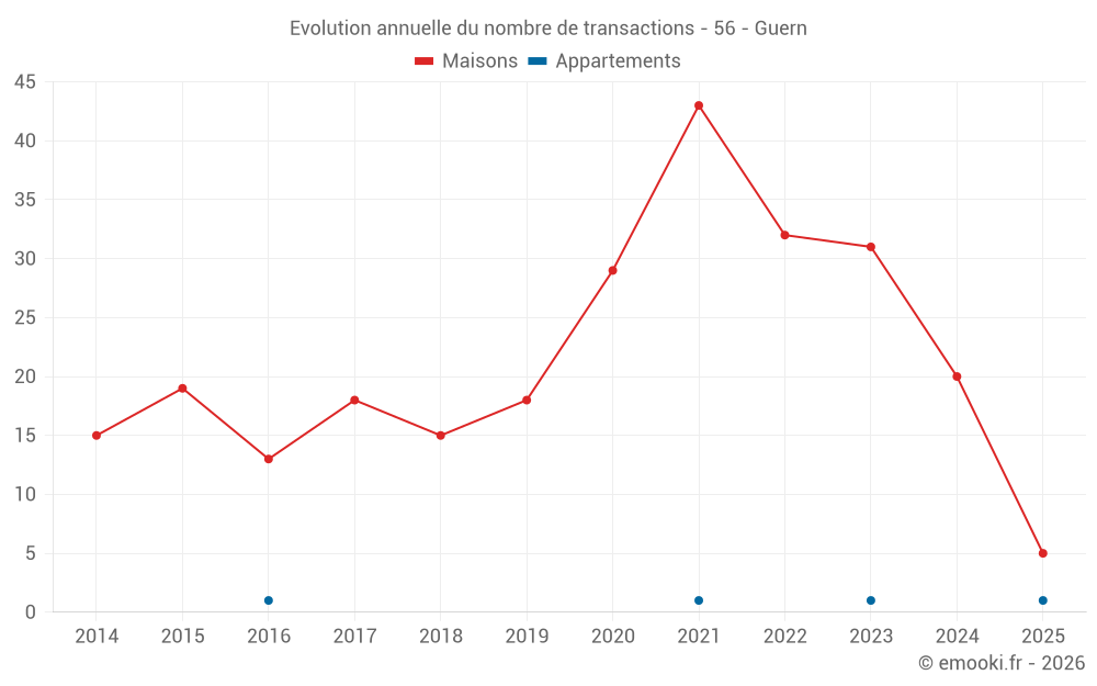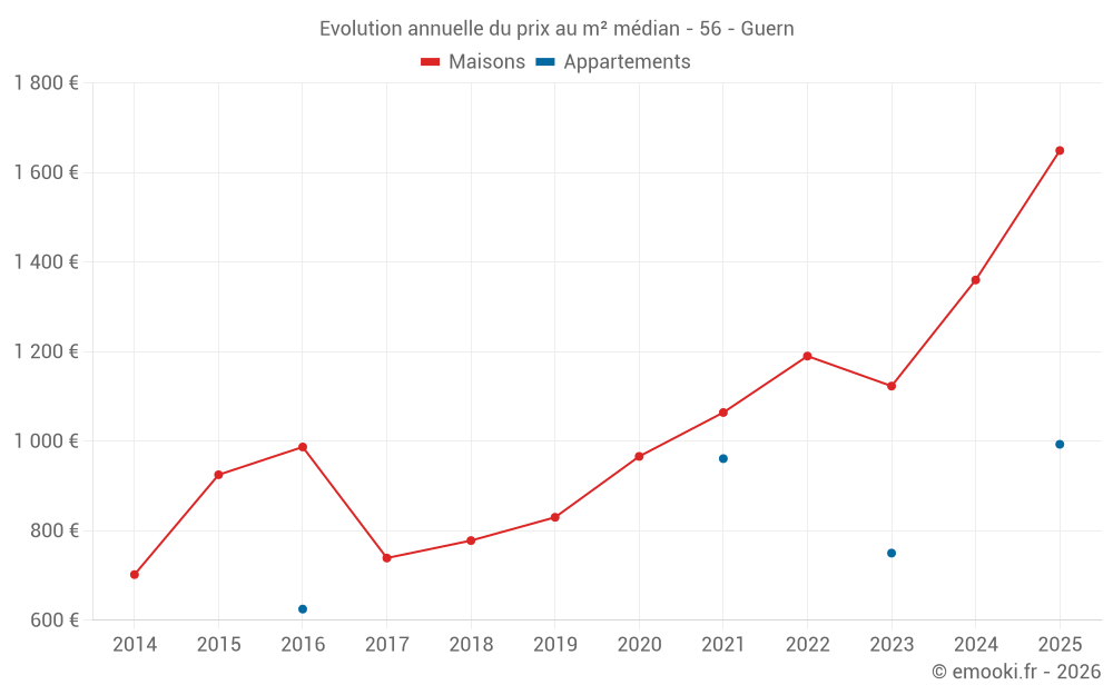 Le prix médian sur les 41 transactions de maisons des 24 derniers mois dans la commune de Guern était de 1 389 € par mètre carré pour une valeur foncière médiane de 130 000 €. Sur cette période 60% des transactions se sont situées entre 848 et 1 750 € par mètre carré (du 2ème au 8ème déciles).