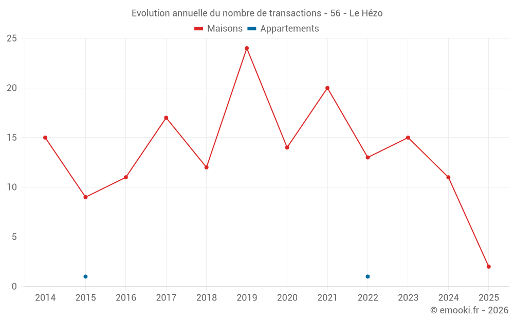 Le prix médian sur les 21 transactions de maisons des 24 derniers mois dans la commune du Hézo était de 4 100 € par mètre carré pour une valeur foncière médiane de 316 800 €. Sur cette période 60% des transactions se sont situées entre 2 970 et 4 541 € par mètre carré (du 2ème au 8ème déciles).