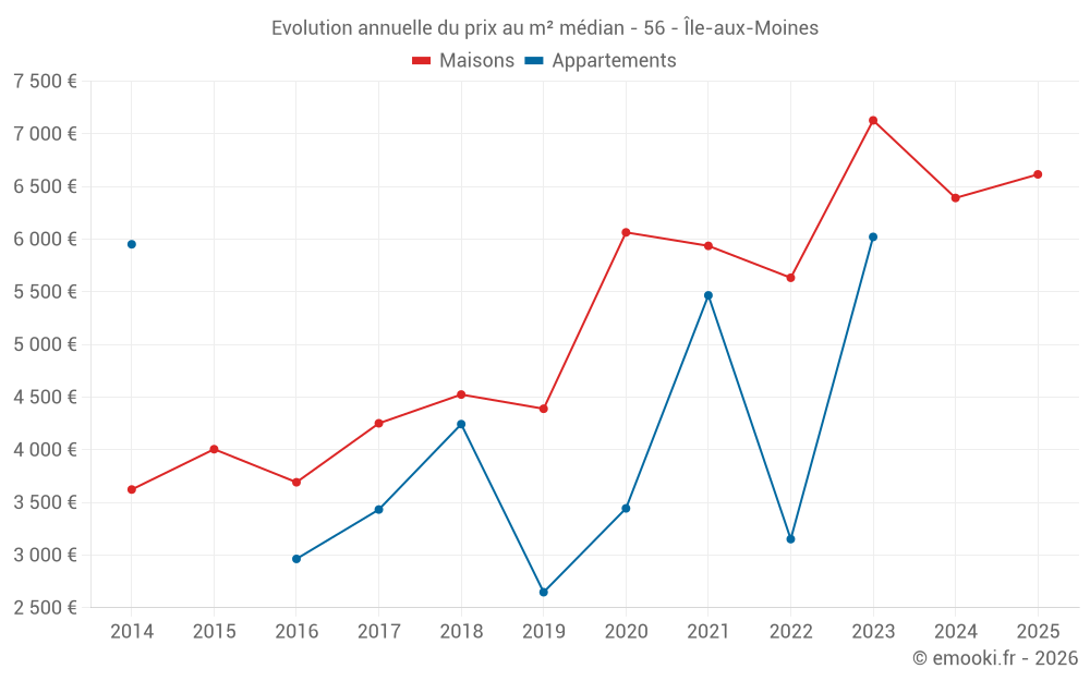 Le prix médian sur les 28 transactions de maisons des 24 derniers mois dans la commune d'Île-aux-Moines était de 6 560 € par mètre carré pour une valeur foncière médiane de 614 250 €. Sur cette période 60% des transactions se sont situées entre 5 733 et 7 845 € par mètre carré (du 2ème au 8ème déciles).