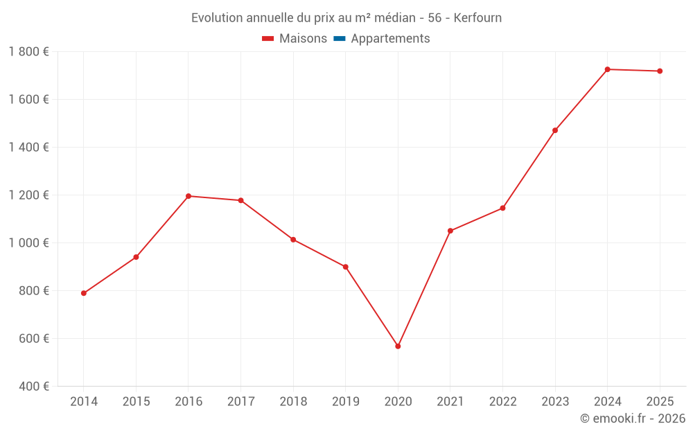 Le prix médian sur les 28 transactions de maisons des 24 derniers mois dans la commune de Kerfourn était de 1 518 € par mètre carré pour une valeur foncière médiane de 151 500 €. Sur cette période 60% des transactions se sont situées entre 875 et 2 104 € par mètre carré (du 2ème au 8ème déciles).