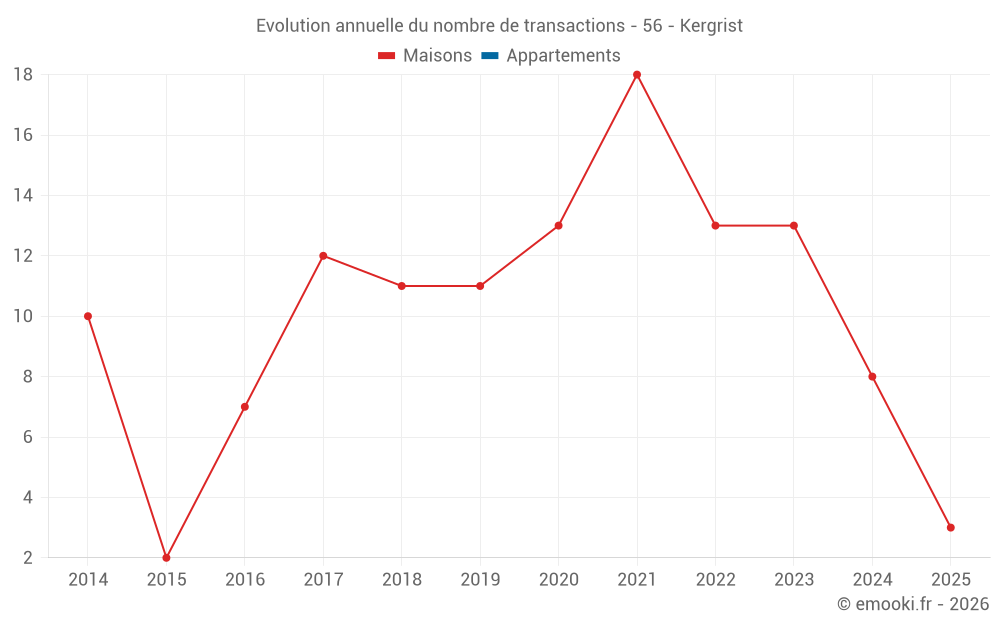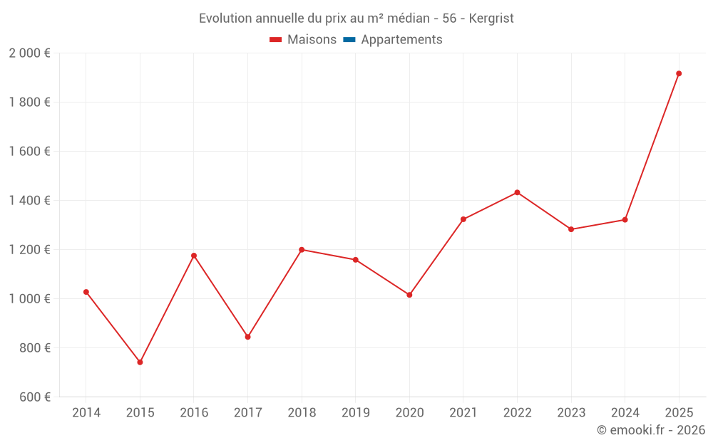 Le prix médian sur les 15 transactions de maisons des 24 derniers mois dans la commune de Kergrist était de 1 393 € par mètre carré pour une valeur foncière médiane de 184 000 €. Sur cette période 60% des transactions se sont situées entre 1 023 et 1 956 € par mètre carré (du 2ème au 8ème déciles).