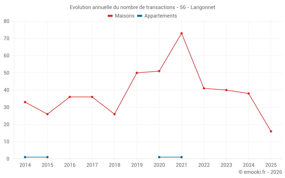 Le prix médian sur les 37 transactions de maisons des 12 derniers mois dans la commune de Langonnet était de 1 223 € par mètre carré pour une valeur foncière médiane de 90 000 €. Sur cette période 60% des transactions se sont situées entre 705 et 1 762 € par mètre carré (du 2ème au 8ème déciles).
