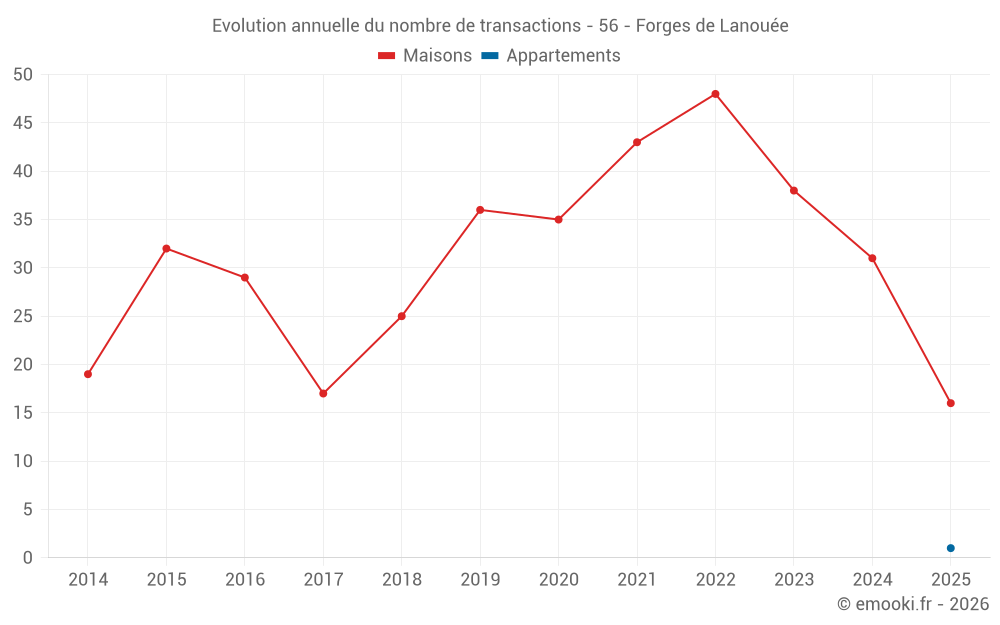 Le prix médian sur les 36 transactions de maisons des 12 derniers mois dans la commune de Forges de Lanouée était de 1 335 € par mètre carré pour une valeur foncière médiane de 135 000 €. Sur cette période 60% des transactions se sont situées entre 771 et 1 822 € par mètre carré (du 2ème au 8ème déciles).