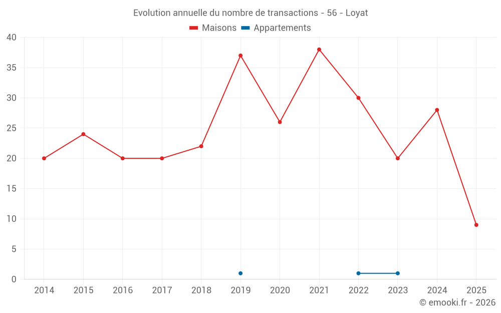 Le prix médian sur les 26 transactions de maisons des 12 derniers mois dans la commune de Loyat était de 1 316 € par mètre carré pour une valeur foncière médiane de 111 210 €. Sur cette période 60% des transactions se sont situées entre 951 et 2 091 € par mètre carré (du 2ème au 8ème déciles).