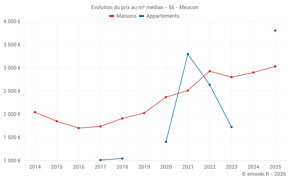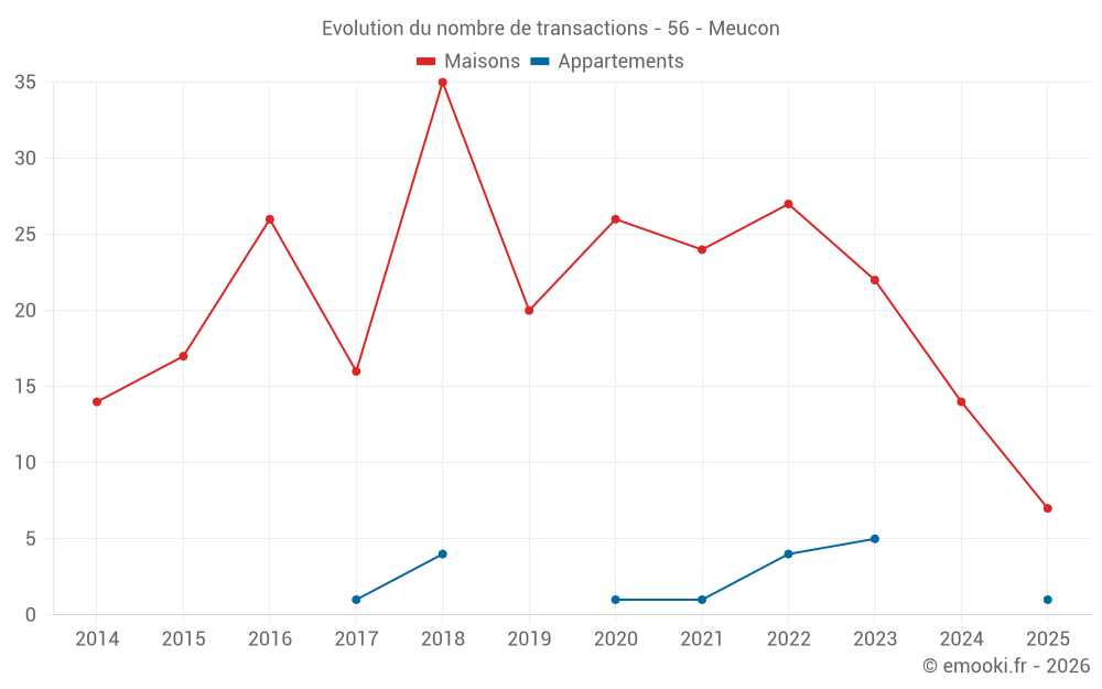 Le prix médian sur les 33 transactions de maisons des 24 derniers mois dans la commune de Meucon était de 2 834 € par mètre carré pour une valeur foncière médiane de 297 430 €. Sur cette période 60% des transactions se sont situées entre 2 075 et 3 457 € par mètre carré (du 2ème au 8ème déciles).