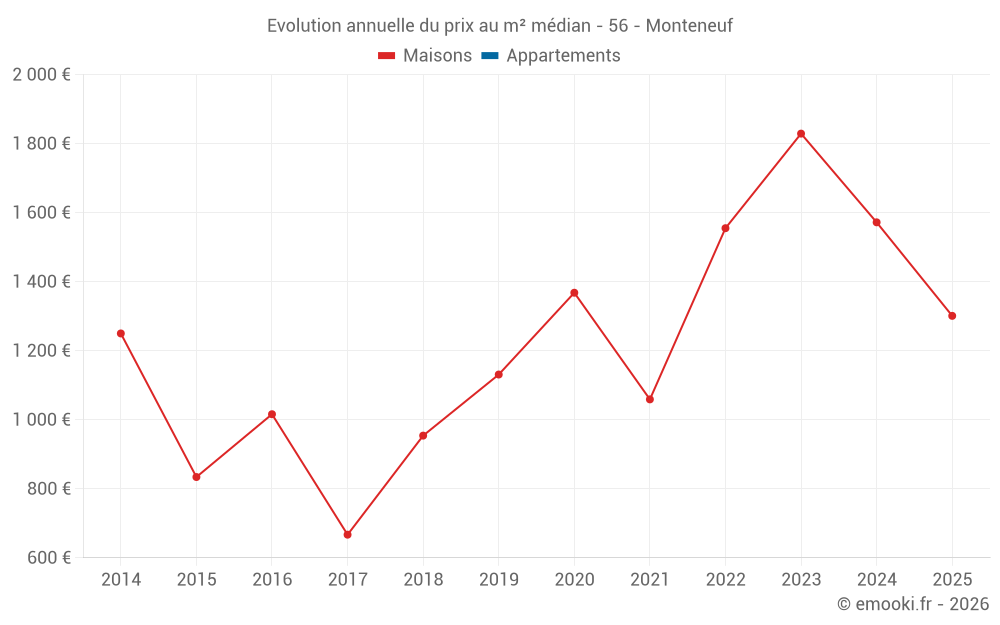 Le prix médian sur les 18 transactions de maisons des 24 derniers mois dans la commune de Monteneuf était de 1 596 € par mètre carré pour une valeur foncière médiane de 149 000 €. Sur cette période 60% des transactions se sont situées entre 1 114 et 2 298 € par mètre carré (du 2ème au 8ème déciles).