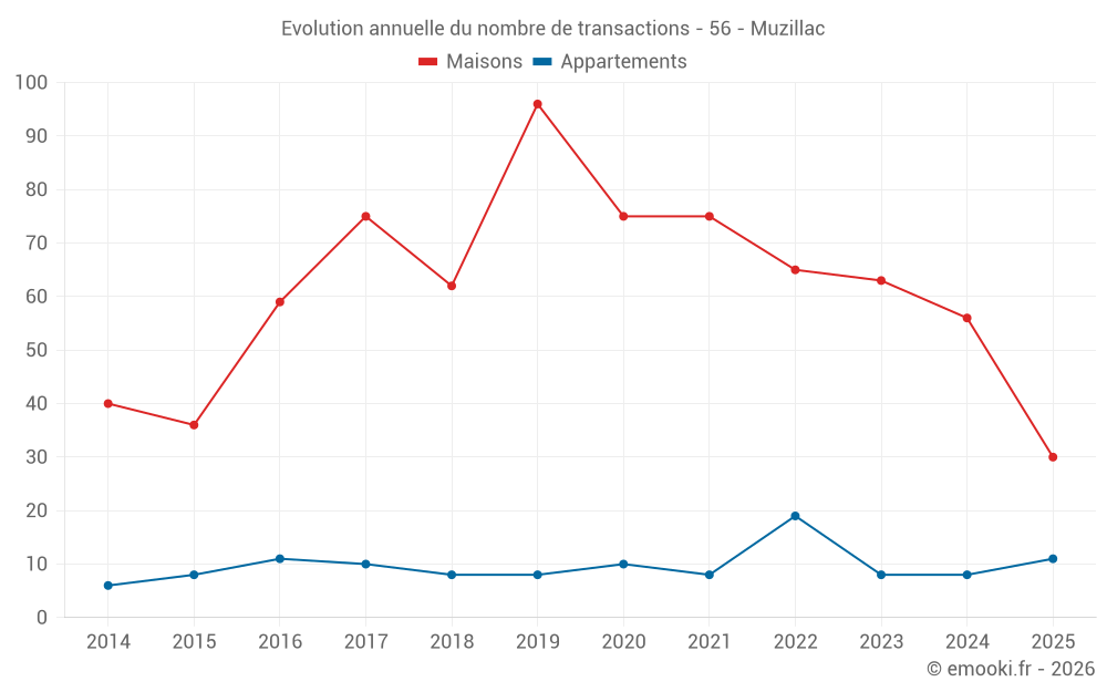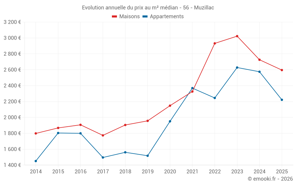 Le prix médian sur les 30 transactions de maisons des 6 derniers mois dans la commune de Muzillac était de 2 596 € par mètre carré pour une valeur foncière médiane de 217 500 €. Sur cette période 60% des transactions se sont situées entre 1 438 et 3 261 € par mètre carré (du 2ème au 8ème déciles).