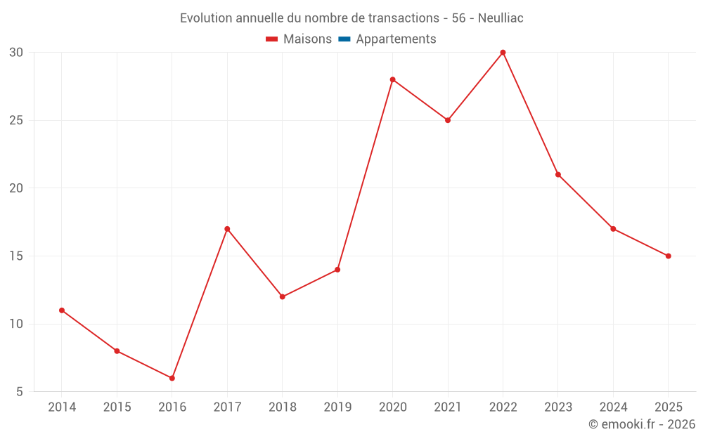 Le prix médian sur les 32 transactions de maisons des 24 derniers mois dans la commune de Neulliac était de 1 648 € par mètre carré pour une valeur foncière médiane de 163 500 €. Sur cette période 60% des transactions se sont situées entre 1 083 et 2 136 € par mètre carré (du 2ème au 8ème déciles).