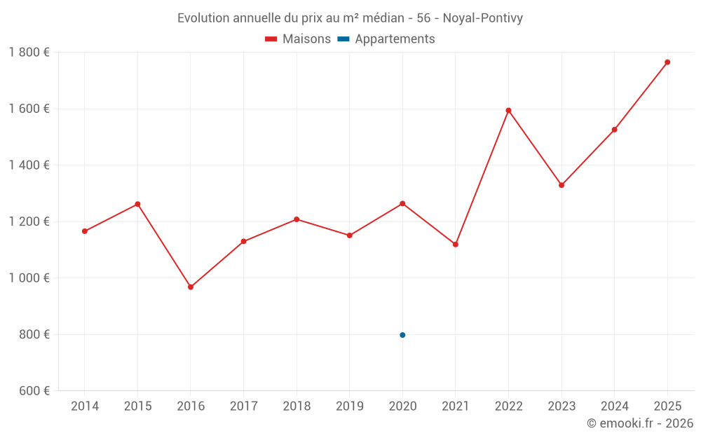 Le prix médian sur les 25 transactions de maisons des 6 derniers mois dans la commune de Noyal-Pontivy était de 1 765 € par mètre carré pour une valeur foncière médiane de 181 518 €. Sur cette période 60% des transactions se sont situées entre 1 206 et 2 231 € par mètre carré (du 2ème au 8ème déciles).