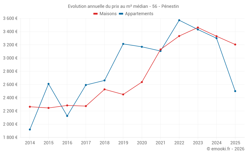 Le prix médian sur les 29 transactions de maisons des 6 derniers mois dans la commune de Pénestin était de 3 205 € par mètre carré pour une valeur foncière médiane de 260 000 €. Sur cette période 60% des transactions se sont situées entre 1 970 et 4 384 € par mètre carré (du 2ème au 8ème déciles).