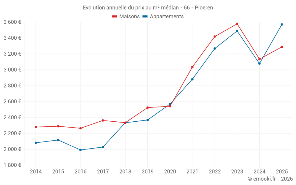 Le prix médian sur les 18 transactions d'appartements des 12 derniers mois dans la commune de Ploeren était de 3 247 € par mètre carré pour une valeur foncière médiane de 157 500 €. Sur cette période 60% des transactions se sont situées entre 2 791 et 4 018 € par mètre carré (du 2ème au 8ème déciles).