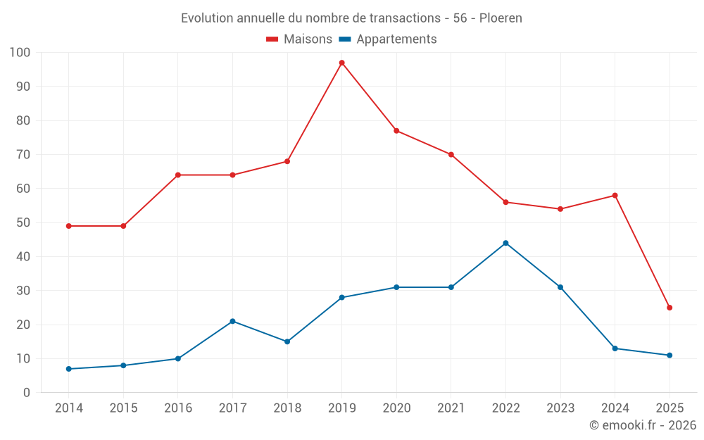 Le prix médian sur les 25 transactions de maisons des 6 derniers mois dans la commune de Ploeren était de 3 288 € par mètre carré pour une valeur foncière médiane de 376 400 €. Sur cette période 60% des transactions se sont situées entre 2 894 et 3 756 € par mètre carré (du 2ème au 8ème déciles).