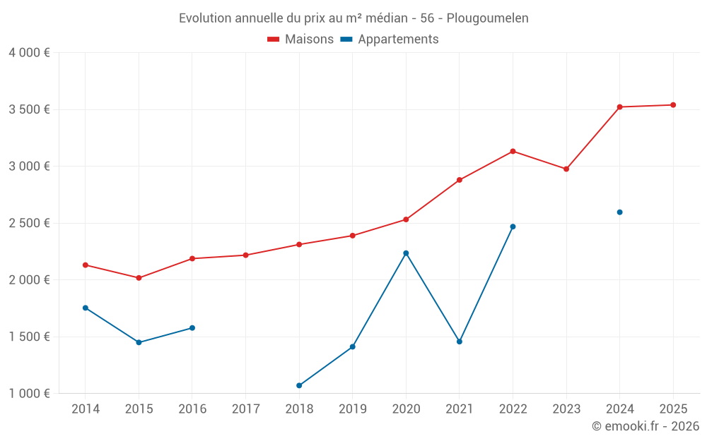 Le prix médian sur les 29 transactions de maisons des 12 derniers mois dans la commune de Plougoumelen était de 3 523 € par mètre carré pour une valeur foncière médiane de 375 000 €. Sur cette période 60% des transactions se sont situées entre 2 763 et 4 406 € par mètre carré (du 2ème au 8ème déciles).
