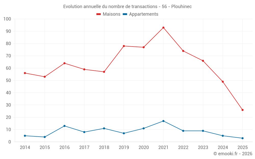Le prix médian sur les 26 transactions de maisons des 6 derniers mois dans la commune de Plouhinec était de 3 135 € par mètre carré pour une valeur foncière médiane de 337 550 €. Sur cette période 60% des transactions se sont situées entre 2 263 et 3 835 € par mètre carré (du 2ème au 8ème déciles).