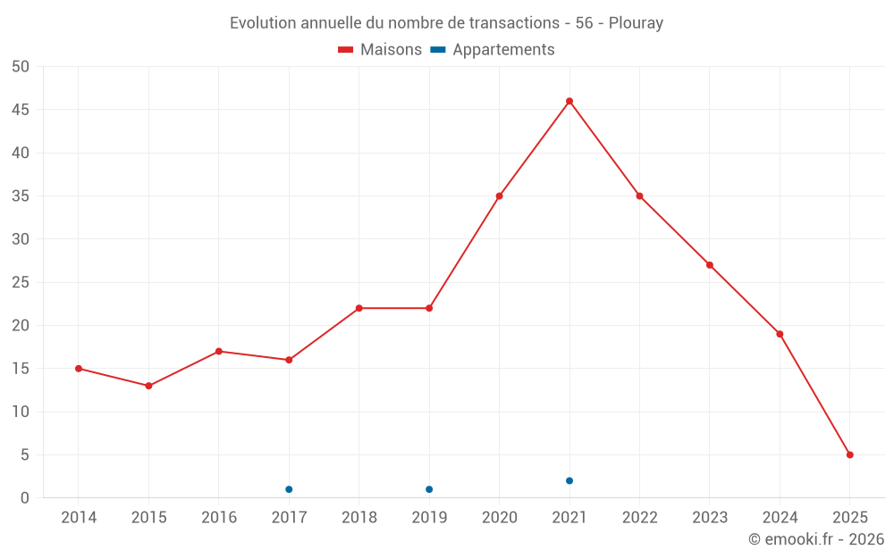Le prix médian sur les 37 transactions de maisons des 24 derniers mois dans la commune de Plouray était de 921 € par mètre carré pour une valeur foncière médiane de 87 200 €. Sur cette période 60% des transactions se sont situées entre 597 et 1 624 € par mètre carré (du 2ème au 8ème déciles).