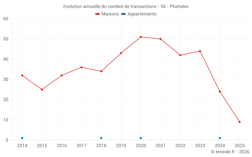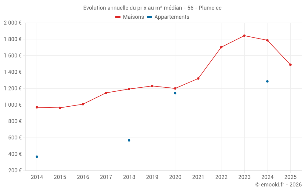 Le prix médian sur les 25 transactions de maisons des 12 derniers mois dans la commune de Plumelec était de 1 667 € par mètre carré pour une valeur foncière médiane de 176 000 €. Sur cette période 60% des transactions se sont situées entre 845 et 1 998 € par mètre carré (du 2ème au 8ème déciles).