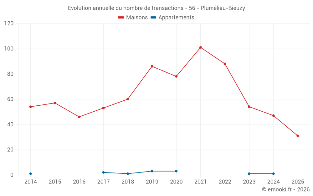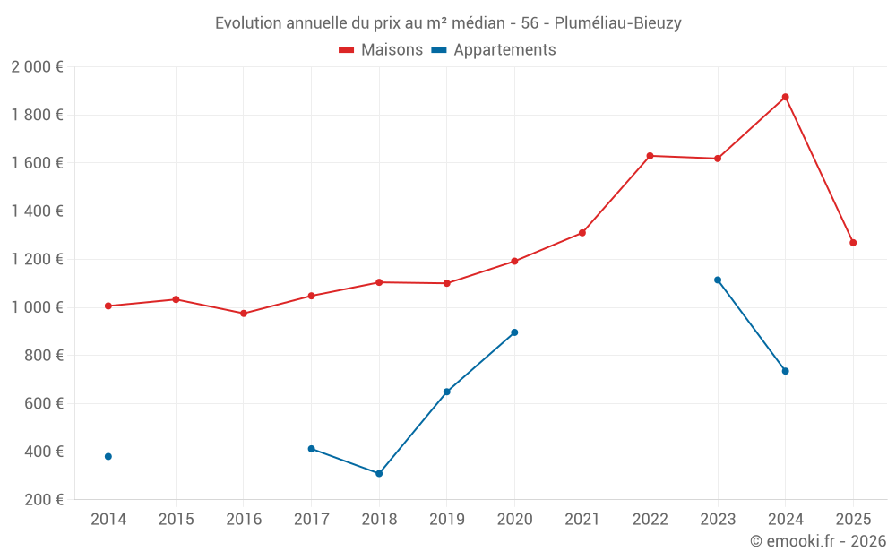Le prix médian sur les 31 transactions de maisons des 6 derniers mois dans la commune de Pluméliau-Bieuzy était de 1 269 € par mètre carré pour une valeur foncière médiane de 115 000 €. Sur cette période 60% des transactions se sont situées entre 773 et 1 917 € par mètre carré (du 2ème au 8ème déciles).