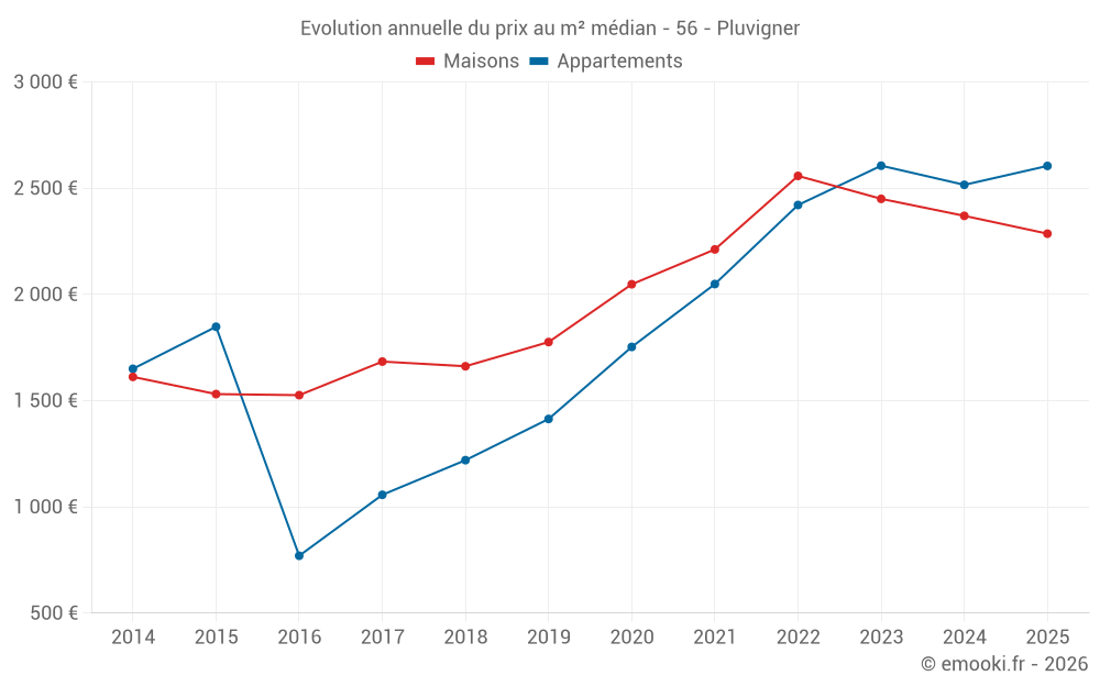 Le prix médian sur les 18 transactions d'appartements des 24 derniers mois dans la commune de Pluvigner était de 2 569 € par mètre carré pour une valeur foncière médiane de 120 000 €. Sur cette période 60% des transactions se sont situées entre 2 232 et 2 912 € par mètre carré (du 2ème au 8ème déciles).