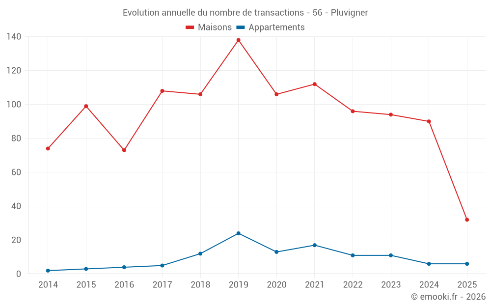 Le prix médian sur les 32 transactions de maisons des 6 derniers mois dans la commune de Pluvigner était de 2 286 € par mètre carré pour une valeur foncière médiane de 237 500 €. Sur cette période 60% des transactions se sont situées entre 1 729 et 2 866 € par mètre carré (du 2ème au 8ème déciles).