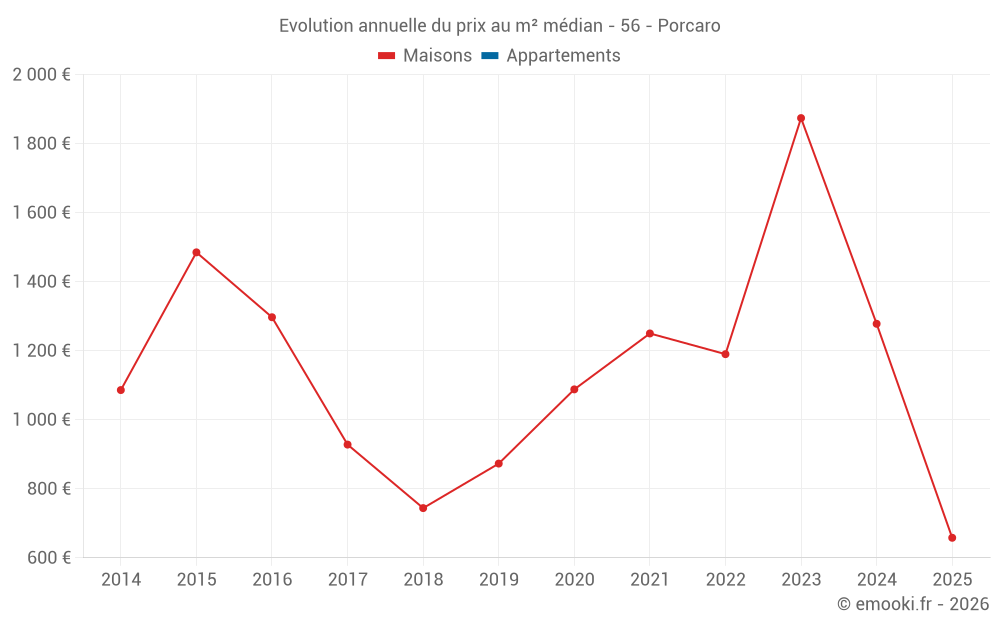 Le prix médian sur les 24 transactions de maisons des 24 derniers mois dans la commune de Porcaro était de 1 482 € par mètre carré pour une valeur foncière médiane de 94 000 €. Sur cette période 60% des transactions se sont situées entre 747 et 2 168 € par mètre carré (du 2ème au 8ème déciles).