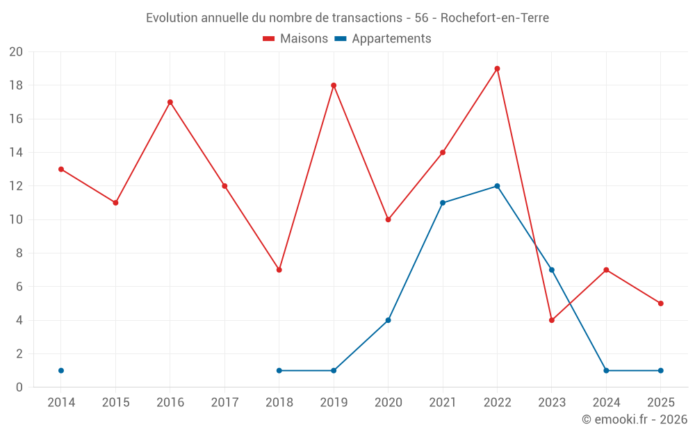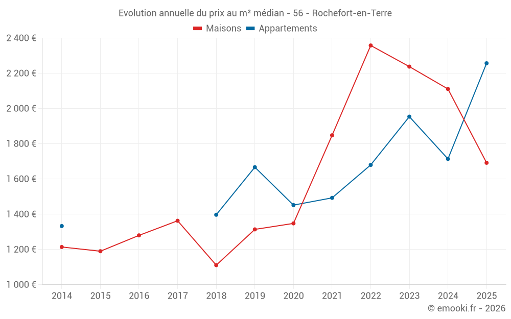 Le prix médian sur les 15 transactions de maisons des 24 derniers mois dans la commune de Rochefort-en-Terre était de 2 111 € par mètre carré pour une valeur foncière médiane de 172 640 €. Sur cette période 60% des transactions se sont situées entre 1 649 et 2 759 € par mètre carré (du 2ème au 8ème déciles).