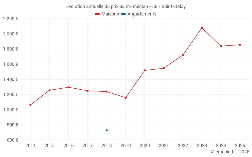 Le prix médian sur les 27 transactions de maisons des 12 derniers mois dans la commune de Saint-Dolay était de 1 869 € par mètre carré pour une valeur foncière médiane de 200 000 €. Sur cette période 60% des transactions se sont situées entre 1 420 et 2 624 € par mètre carré (du 2ème au 8ème déciles).