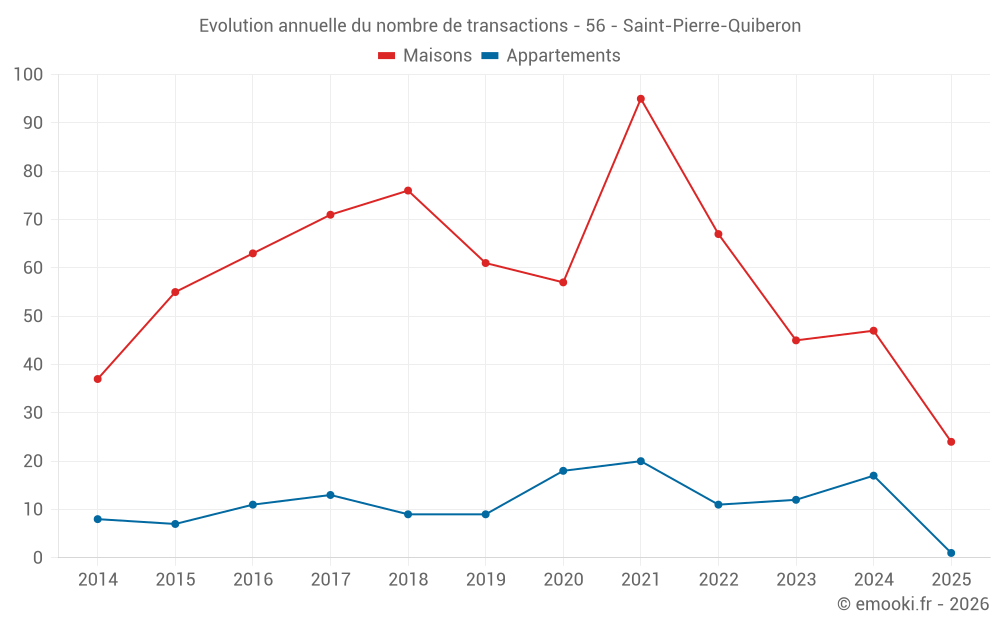 Le prix médian sur les 24 transactions de maisons des 6 derniers mois dans la commune de Saint-Pierre-Quiberon était de 3 195 € par mètre carré pour une valeur foncière médiane de 345 000 €. Sur cette période 60% des transactions se sont situées entre 1 334 et 5 232 € par mètre carré (du 2ème au 8ème déciles).