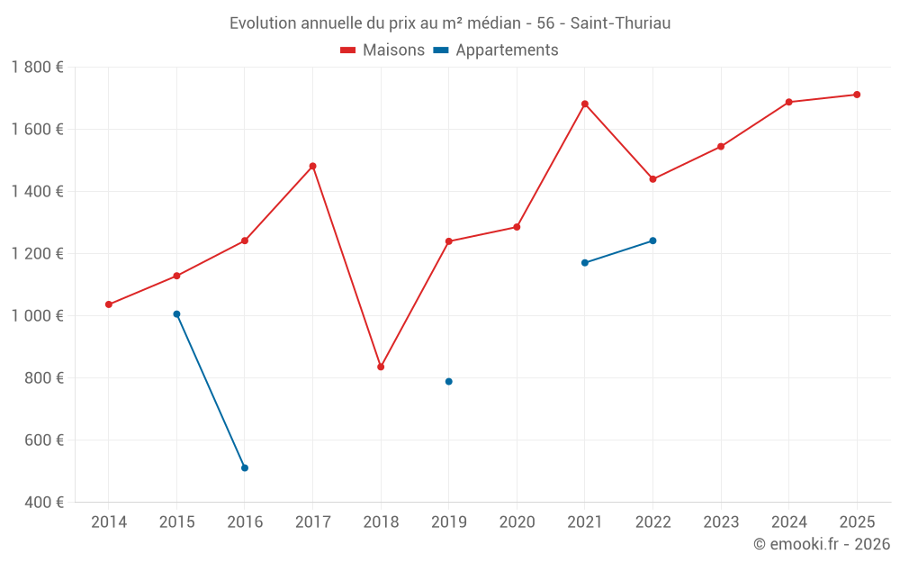 Le prix médian sur les 22 transactions de maisons des 12 derniers mois dans la commune de Saint-Thuriau était de 1 706 € par mètre carré pour une valeur foncière médiane de 155 000 €. Sur cette période 60% des transactions se sont situées entre 1 204 et 2 403 € par mètre carré (du 2ème au 8ème déciles).