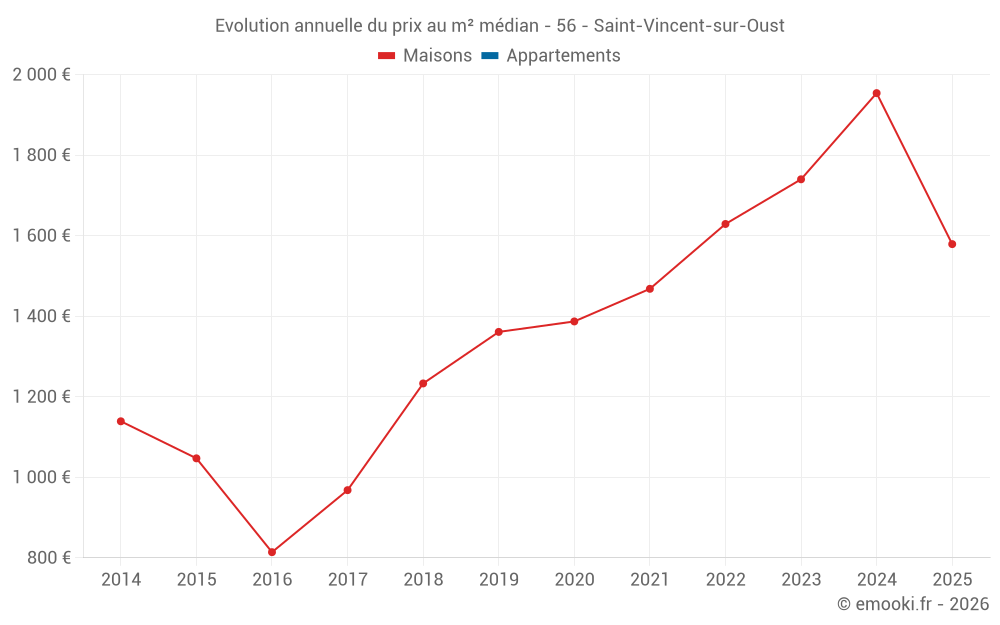 Le prix médian sur les 17 transactions de maisons des 12 derniers mois dans la commune de Saint-Vincent-sur-Oust était de 1 579 € par mètre carré pour une valeur foncière médiane de 130 000 €. Sur cette période 60% des transactions se sont situées entre 904 et 2 280 € par mètre carré (du 2ème au 8ème déciles).
