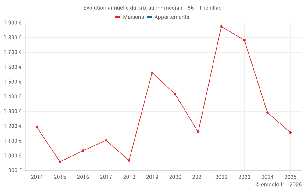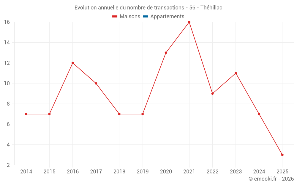 Le prix médian sur les 16 transactions de maisons des 24 derniers mois dans la commune de Théhillac était de 1 501 € par mètre carré pour une valeur foncière médiane de 135 000 €. Sur cette période 60% des transactions se sont situées entre 682 et 2 047 € par mètre carré (du 2ème au 8ème déciles).