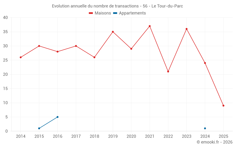 Le prix médian sur les 19 transactions de maisons des 12 derniers mois dans la commune du Tour-du-Parc était de 3 760 € par mètre carré pour une valeur foncière médiane de 460 000 €. Sur cette période 60% des transactions se sont situées entre 2 650 et 4 744 € par mètre carré (du 2ème au 8ème déciles).