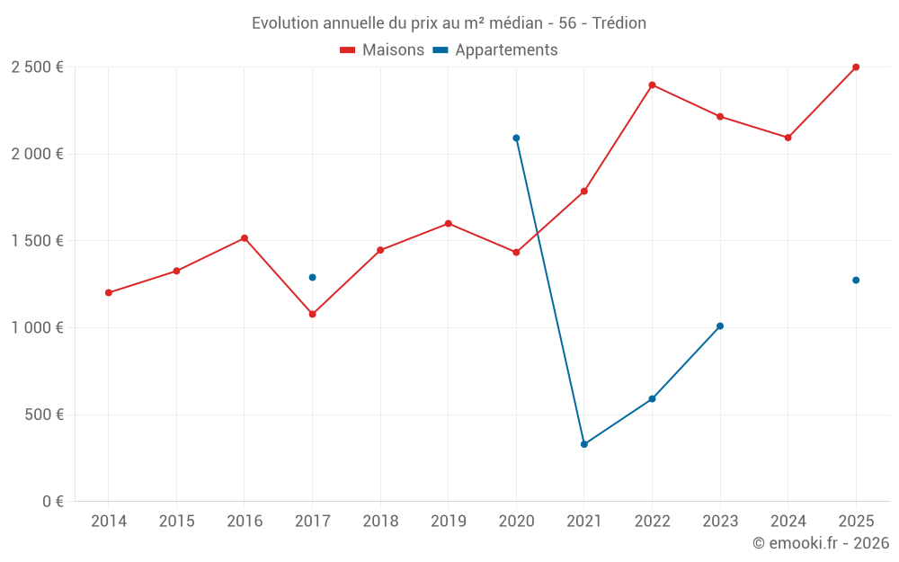 Le prix médian sur les 23 transactions de maisons des 24 derniers mois dans la commune de Trédion était de 2 175 € par mètre carré pour une valeur foncière médiane de 200 000 €. Sur cette période 60% des transactions se sont situées entre 1 725 et 2 655 € par mètre carré (du 2ème au 8ème déciles).