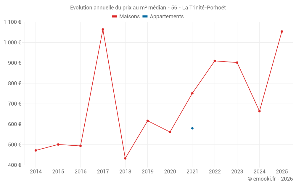 Le prix médian sur les 16 transactions de maisons des 12 derniers mois dans la commune de la Trinité-Porhoët était de 894 € par mètre carré pour une valeur foncière médiane de 76 000 €. Sur cette période 60% des transactions se sont situées entre 625 et 1 400 € par mètre carré (du 2ème au 8ème déciles).