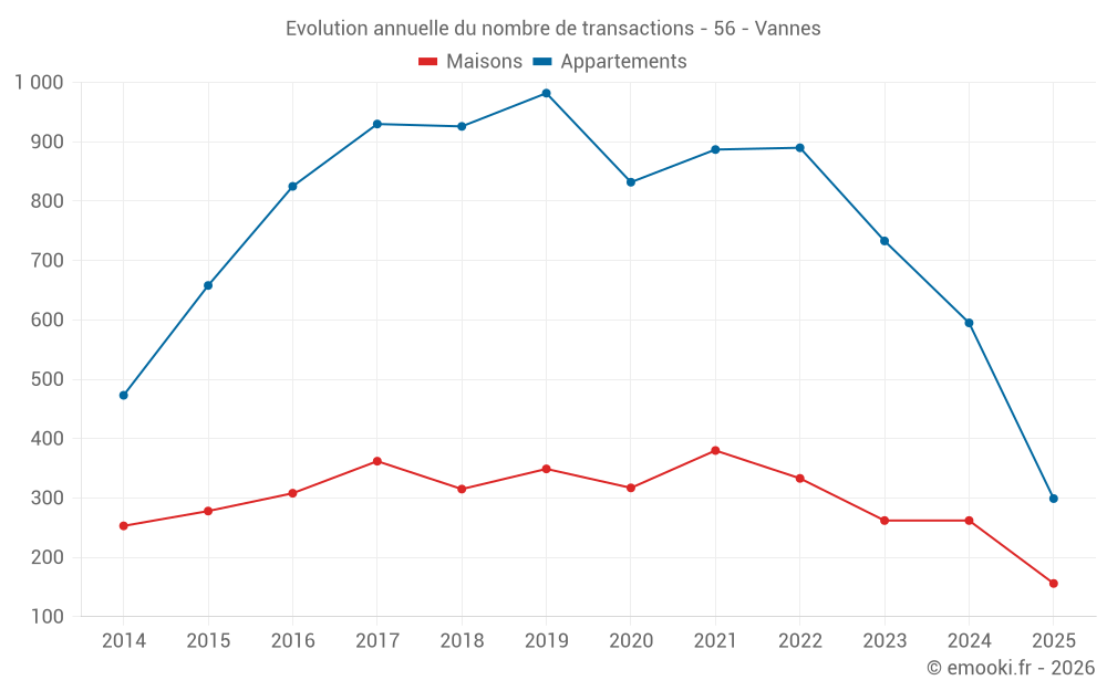 Le prix médian sur les 154 transactions d'appartements des 3 derniers mois dans la commune de Vannes était de 3 826 € par mètre carré pour une valeur foncière médiane de 185 000 €. Sur cette période 60% des transactions se sont situées entre 3 239 et 4 527 € par mètre carré (du 2ème au 8ème déciles).