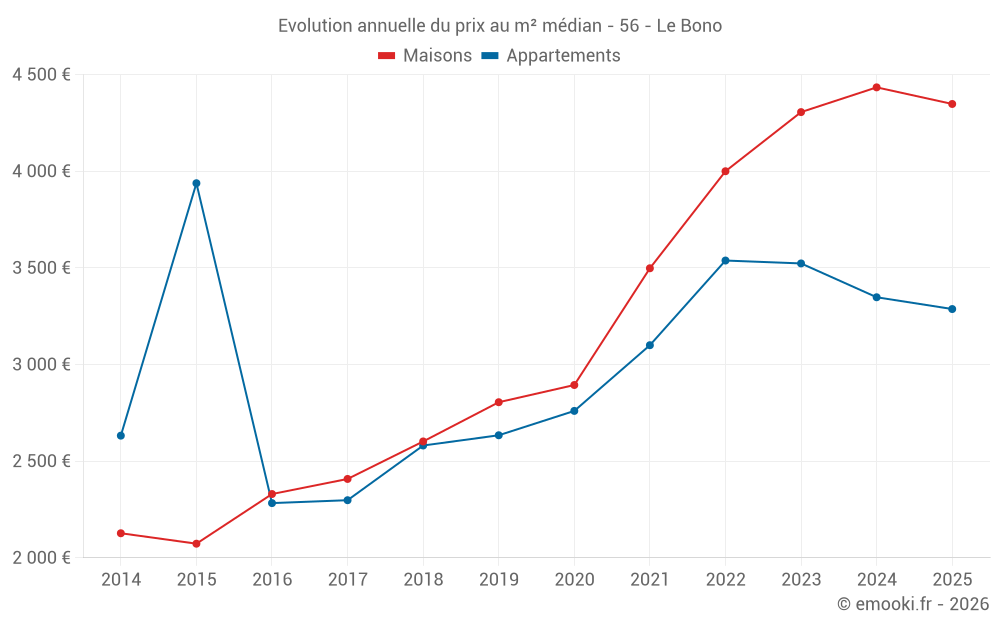 Le prix médian sur les 16 transactions d'appartements des 24 derniers mois dans la commune du Bono était de 3 340 € par mètre carré pour une valeur foncière médiane de 205 000 €. Sur cette période 60% des transactions se sont situées entre 2 743 et 3 860 € par mètre carré (du 2ème au 8ème déciles).